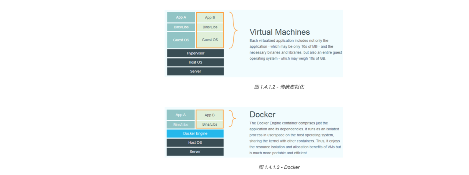 比较上面两张图,我们发现虚拟机是携带操作系统,本身很小的应用程序却因为携带了操作系统而变得非常大,很笨重。Docker是不携带操作系统的,所以Docker的应用就非常的轻巧。另外在调用宿主机的CPU、磁盘等等这些资源的时候,拿内存举例,虚拟机是利用Hypervisor去虚拟化内存,整个调用过程是虚拟内存->虚拟物理内存->真正物理内存,但是Docker是利用Docker Engine去调用宿主的的资源,这时候过程是虚拟内存->真正物理内存。
