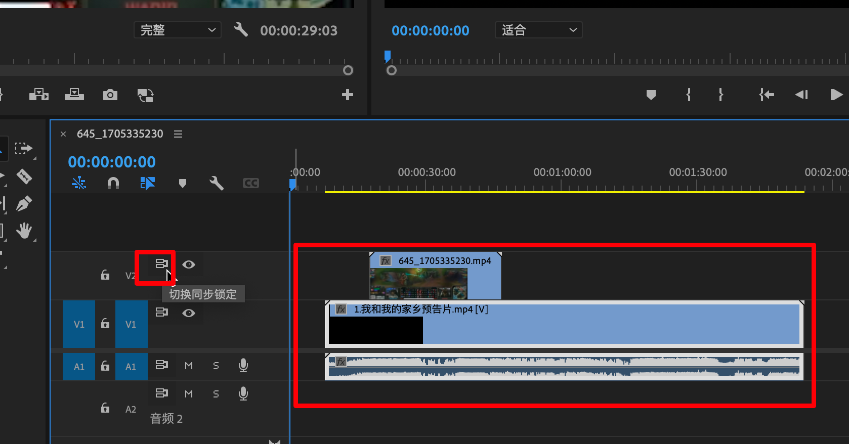 2.点击同步锁定,我们插入素材,同步锁定的这条轨道的素材不会往后移