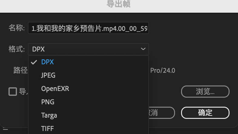 相当于截图的意思,源监视器面板和节目面板都有这个导出帧的选项,功能都是一样的。我们可以把这一帧导出,可以选择不同的导出格式