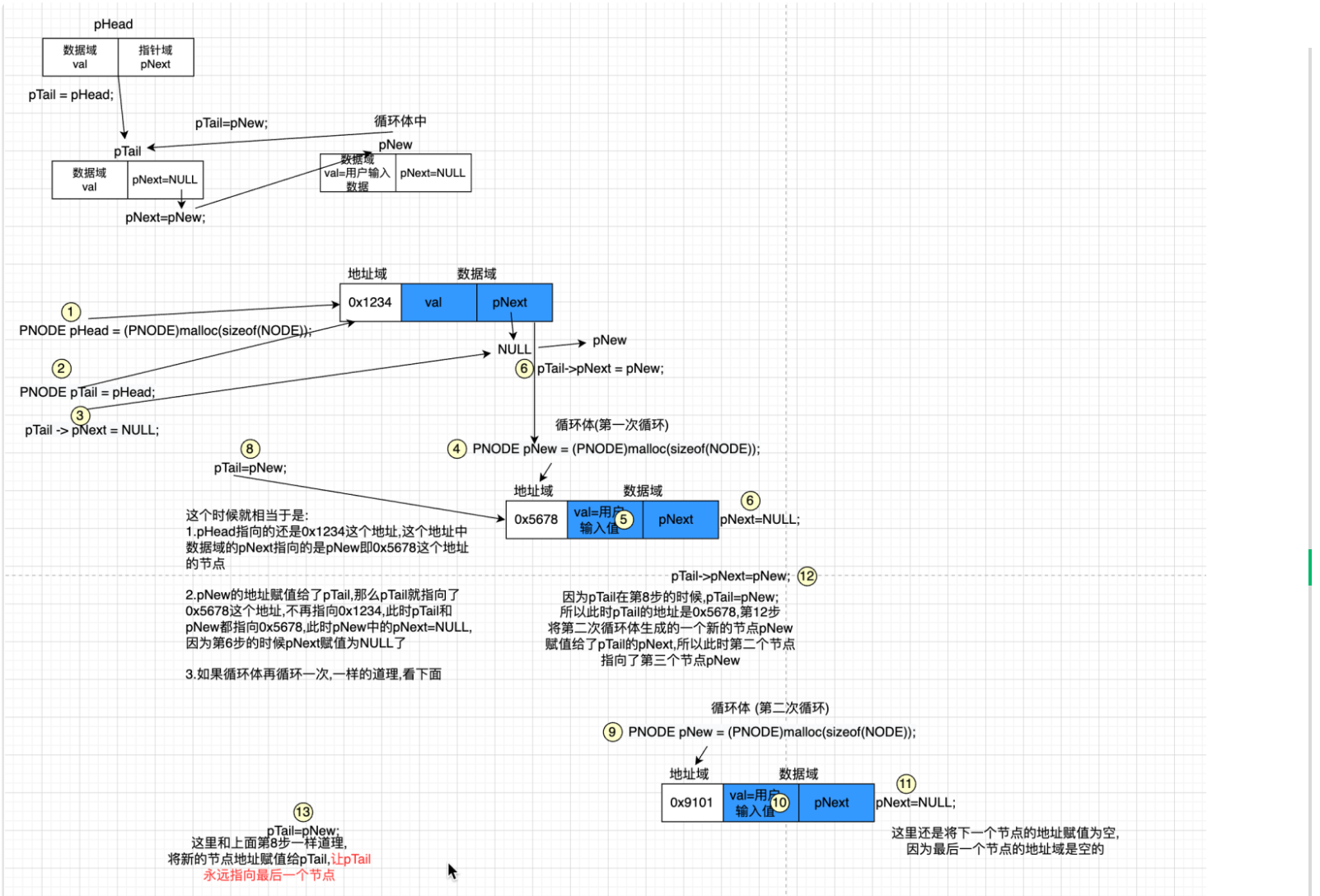 pNode->pNext = NULL; //就是pBottom指向的是最后一个节点,最后一个节点的pNext应该是空的